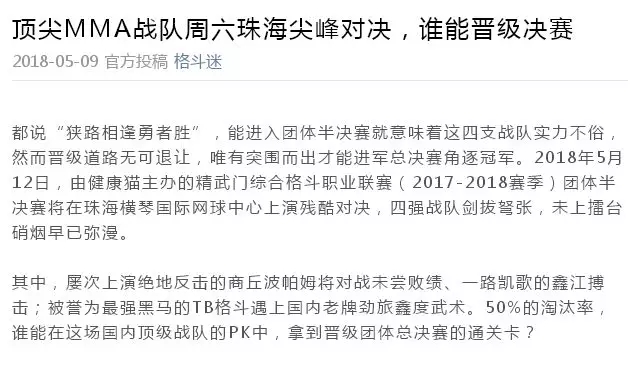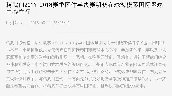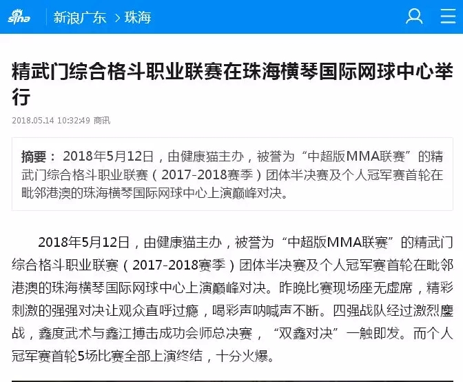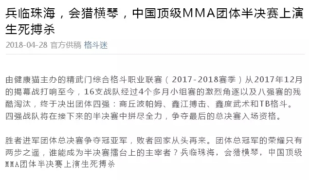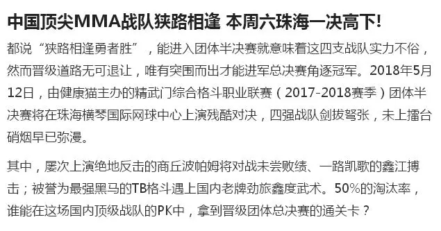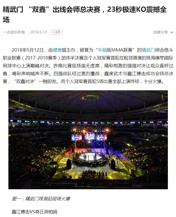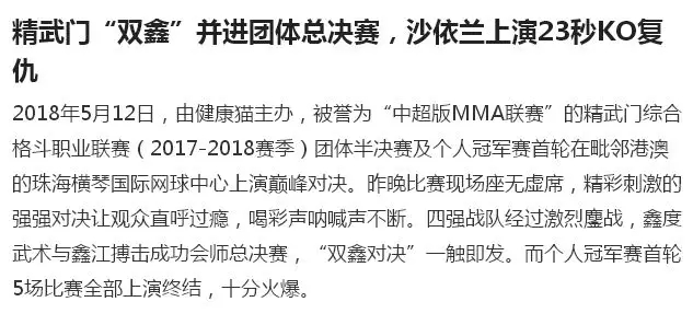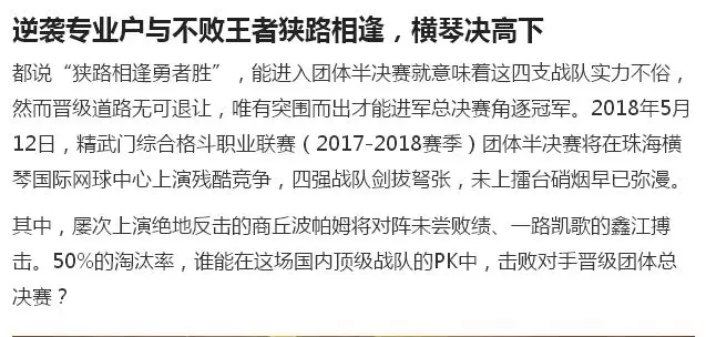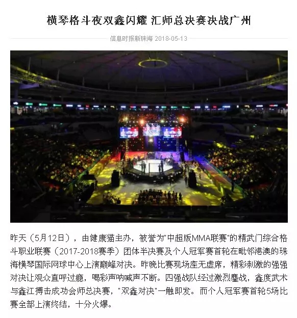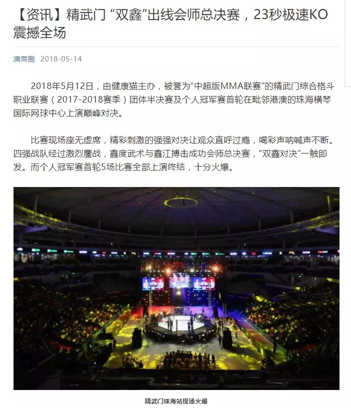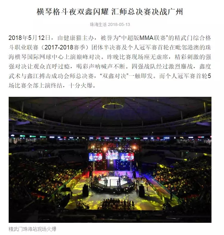 2018年5月12日,精武門綜合格斗職業聯賽(2017—2018賽季)團體半決賽在珠海橫琴國際網球中心圓滿落幕。鑫江搏擊3:2險勝商丘波帕姆,成功拿到團體總決賽的入場券。