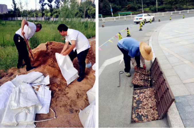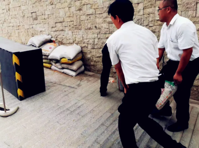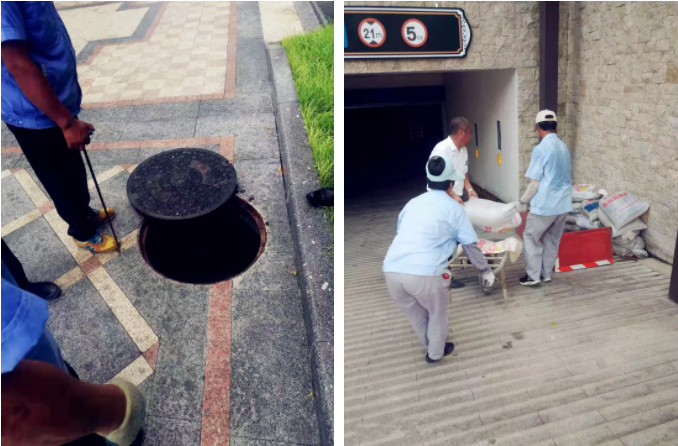 8月9日下午2點,安全檢查小組開始對排水系統(tǒng)、天溝等進行疏通,在地庫門口等關鍵位置放置防汛沙袋。
