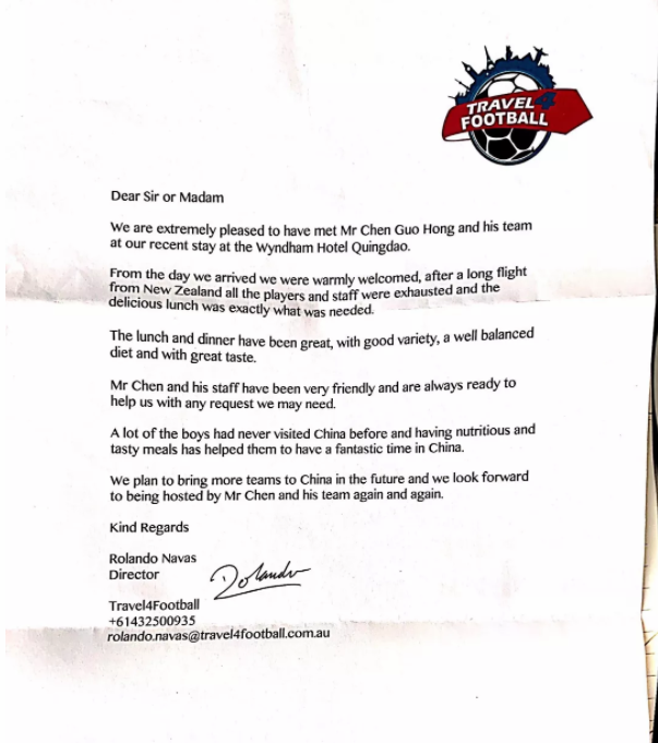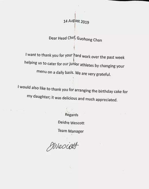 青島鑫江溫德姆酒店團隊,辛勤的服務和付出和努力,得到了入住球隊的認可。我們收到了來自澳大利亞球隊秘書,及新西蘭球隊理事的書面感謝信。大家對酒店廚師長,及廚師團隊表達了親切的問候與感謝,特別對酒店健康、豐富的食材,搭配均衡的三餐,以及親情化的服務表達了感謝。新西蘭球隊理事,更是希望以后在中國的團隊,都由溫德姆酒店提供服務。