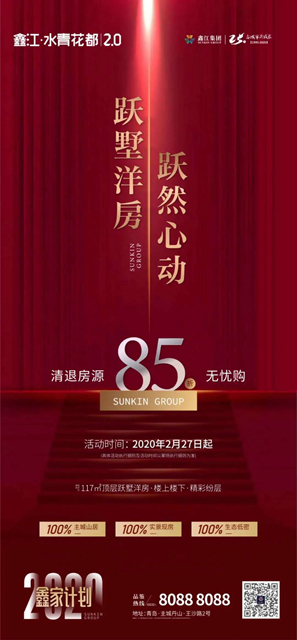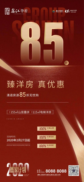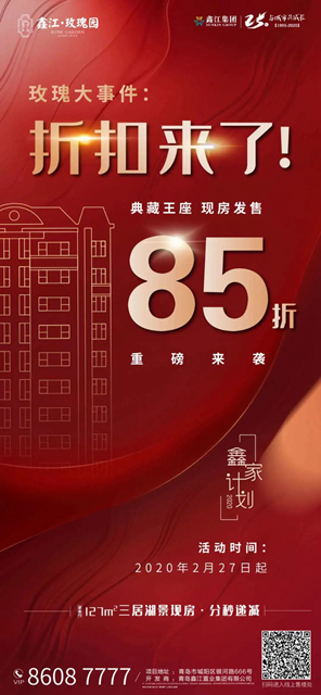 2月27日,鑫江集團隆重推出“2020鑫家計劃”,電梯洋房、山居疊拼、瞰景小高層等多樣精品住宅85折優惠讓利,這是繼恒大之后,給青島樓市的最大一份“禮包”,引人矚目!