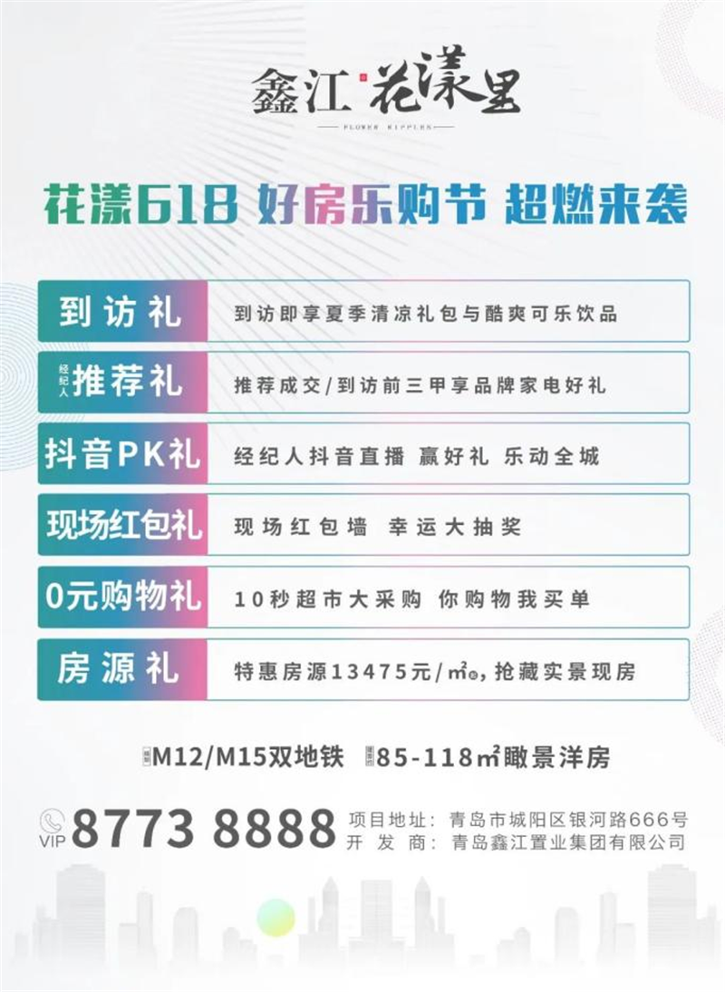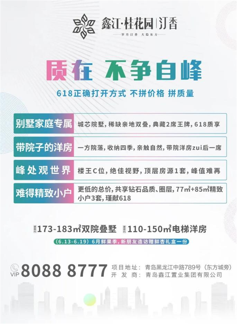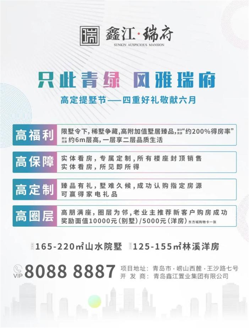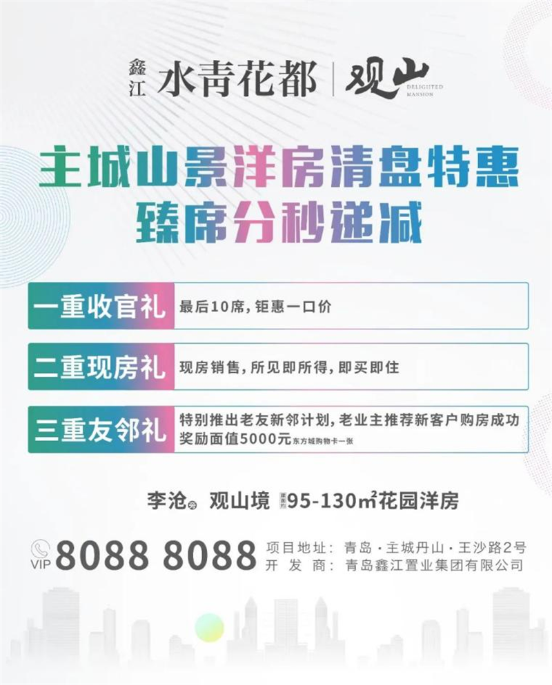 免責聲明:本資料為要約邀請,不作為要約或承諾;買賣雙方的權利義務以雙方簽訂的《商品房買賣合同》及其補充協議、附件等書面文件為準;相關宣傳內容不排除因政府相關規劃、規定及出賣人分期規劃、未能控制等原因發生變化;本資料所發布內容為2022年6月前的信息,出賣人將不定期對宣傳材料進行修改,敬請留意最新資料。鑫江·桂花園、鑫江·水青花都|觀山現房銷售,鑫江·花漾里南區房源現房銷售,二批次于2023年6月30日前交付,鑫江瑞府于2023年6月30日前交付。項目按照雙方簽訂的合同,以實際交付為準。最終解釋權歸青島鑫江置業集團有限公司所有。