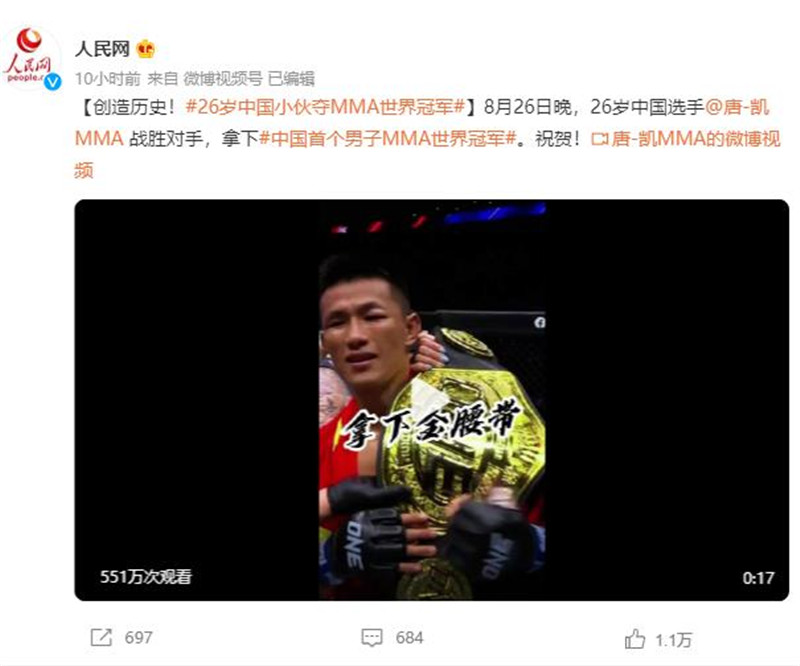 在當(dāng)?shù)?月26日的比賽中,唐凱憑借前幾回合擊倒對(duì)手以及給丹勒造成的腿部重創(chuàng)奪得羽量級(jí)世界冠軍!