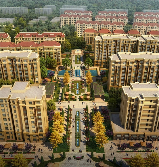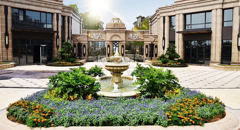 水青木華家園一心一環兩軸的景觀組團布局,水、綠地、石、亭組成的中心活動廣場,設置小橋流水、疊泉、流瀑、潛溪的中央戲水景區,定時開放的噴泉和大型塑像,共同構建自然柔美的循環水系景觀。